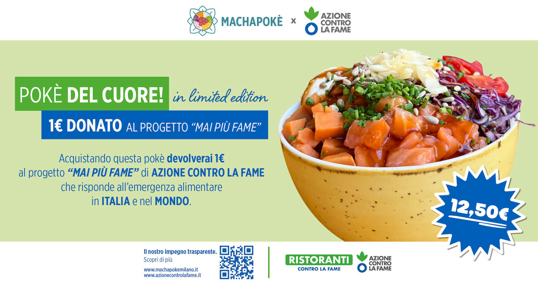 Acquistando questa pokè devolverai 1€ al progetto “MAI PIÙ FAME” di AZIONE CONTRO LA FAME che risponde all’emergenza alimentare in Italia e nel mondo.